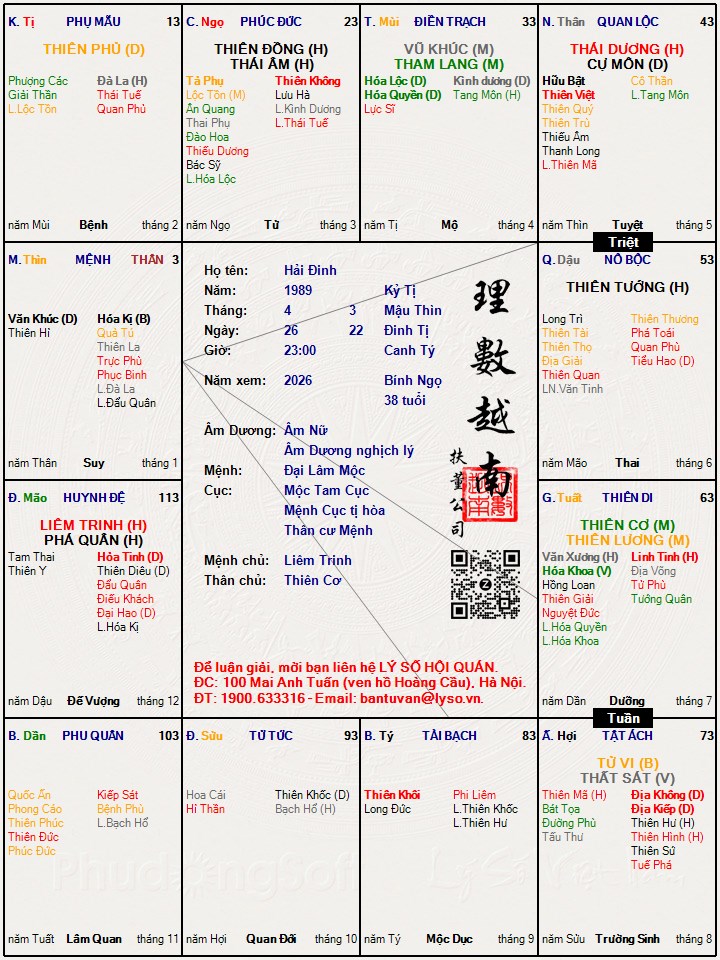 [img]<a%20href=https://lyso.vn/lasotuvi/2/230026 ... nh.jpg%20/>[/img]Nhờ bác Tây Đô xem giúp cháu xem có duyên âm theo không? và có căn số gì không? Hiện tại công việc của cháu rất trắc trở, và tình duyên cũng gặp nhiều khó khăn.