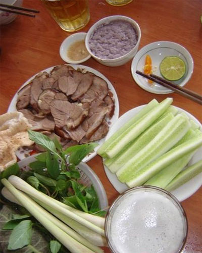 - Rau mùi ta, kinh giới, tía tô, húng láng, giá đỗ, dưa chuột, ớt tươi, tỏi băm nhuyễn, bột sắn ( hoặc bột đao)