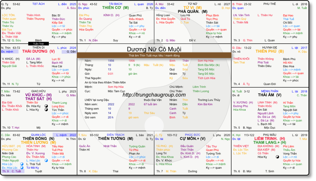 Mệnh Thái Âm tự Hoá quyền vượng địa ở Tuất, lại sinh vào ban đêm, hội Văn xương Hoá khoa, đối cung là Thái dương vượng địa, mệnh hội Khoa Quyền Lộc :cô đẹp tươi như trăng rằm, uy quyền vang dội nhưng lại thích ẩn thân, chồng danh giá.