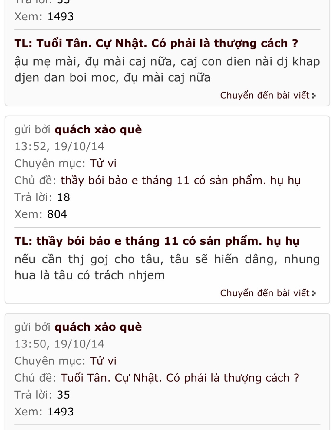 Điều hành 9..xem nội dung Quách Xão què (được gọi là thầy!!!) ibox cho 1 phụ nữ..vứi nội dung thô tục mất tính người như thế này! thì có thể xử lý vi phạm theo điều 2 của Nội quy diễn đàn hơm?Điều hành 9 đã viết:Nói có sách, mách có chứng, các bạn cứ đưa chứng cớ ( chụp ảnh hộp thư đến, tin nhắn trên " diễn đàn này" các ních dụ dỗ nạp card, lôi kéo trả tiền xem số, mình sẽ tùy theo mức độ mà xử lý. còn việc công bố các ních lừa đảo thì mình thấy không cần thiết, diễn đàn mình là diễn đàn mở, nên việc đky ních, lập topic là khá thoải mái, bởi có trên dưới 10 ních/ tháng liên tục lập topic lôi kéo, xem số trả tiền, chửi nhau loạn xạ. Bận thì bận nhưng có việc làm vẫn vui. Các bạn có thông tin gì cứ trực tiếp pm về hòm thư của mình, có chứng cứ vi phạm mình sẽ xử lý. Chúc các bạn vui vẻ.