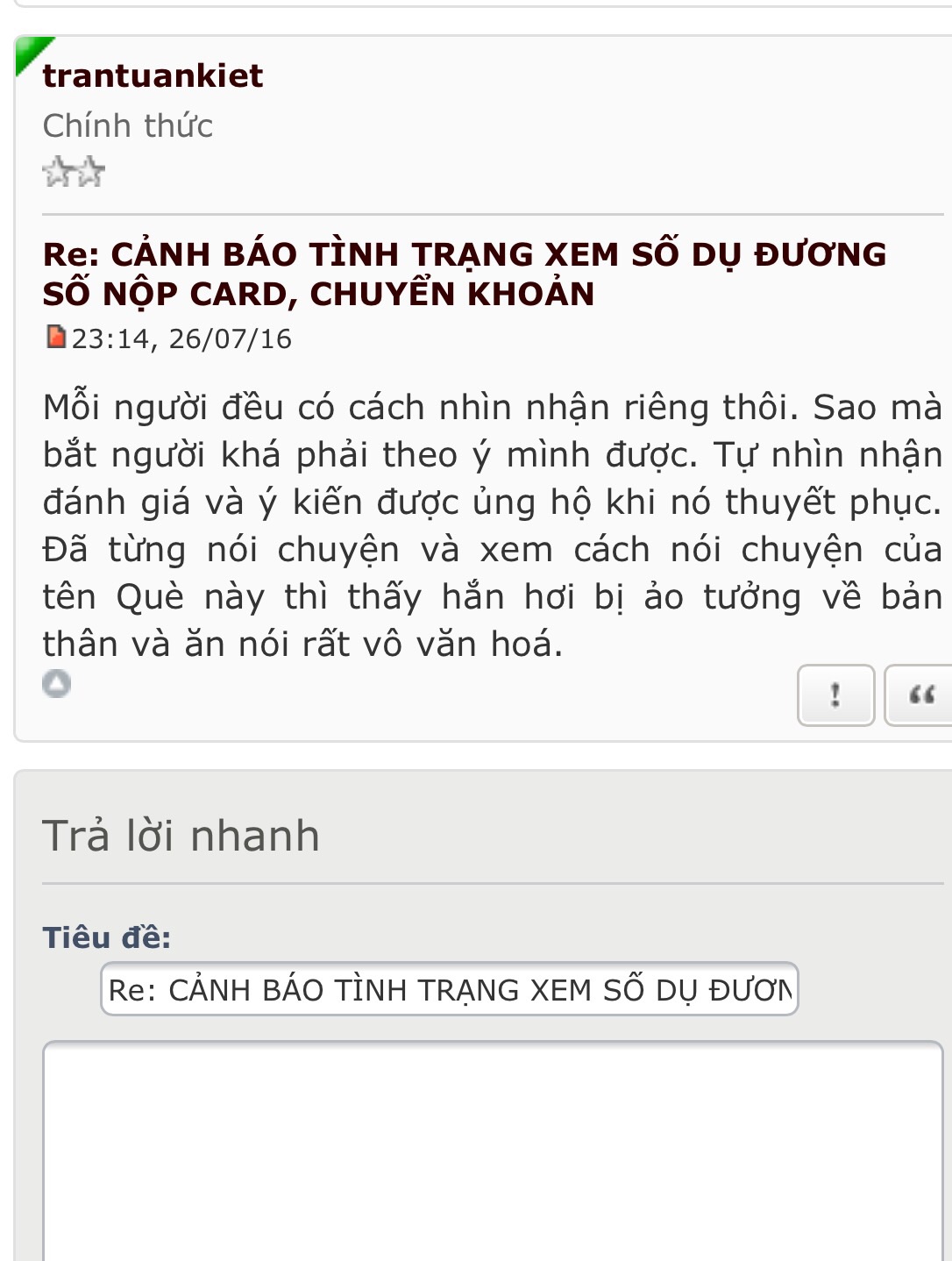 Em gái đừng ngậm máu phun người nếu em ko có chứng cứ. Em có dám thề với anh nếu em là quách xảo què thì cả nhà em bị xe cán chết không.Tay Do Dao Si đã viết:ni cô xuống núi đã viết:Làm gì chưa cần biết mà lấy nick bác Tây Đô để mạo danh vào chửi bới là tư cách ko đàng hoàng rồi. Mấy thể loại này chuyên núp bóng đêm cắn trộm ko nên quan tâm nhìu.