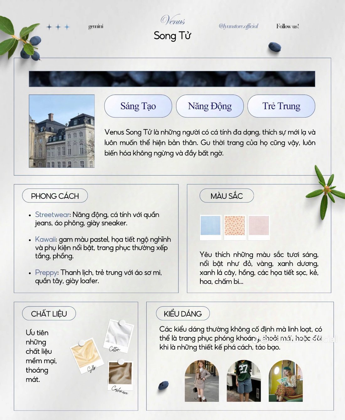 Thời trang theo Venus Song Tử không phải là gu của mình. Mình không thích phong cách streetwear, kawaii hay preppy gì cả. Mà phong cách mình yêu thích lại là sự kết hợp của sự sexy, dịu dàng và đơn giản. Màu sắc cũng vậy, mình không bị cuốn hút bởi các màu sắc trong ảnh, mà màu mình yêu thích là đỏ và hồng pastel.