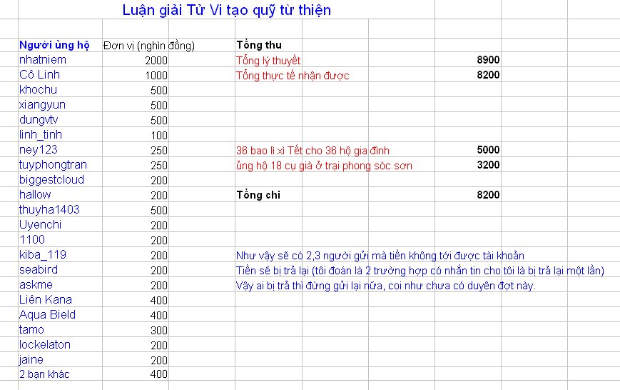 Tôi vừa nhận được tiền gửi của chị nhatniem, và của anh tuyphongtran gặp mặt trực tiếp do việc chuyển khoản bị lỗi. Nên tôi thống kê lại như sau.