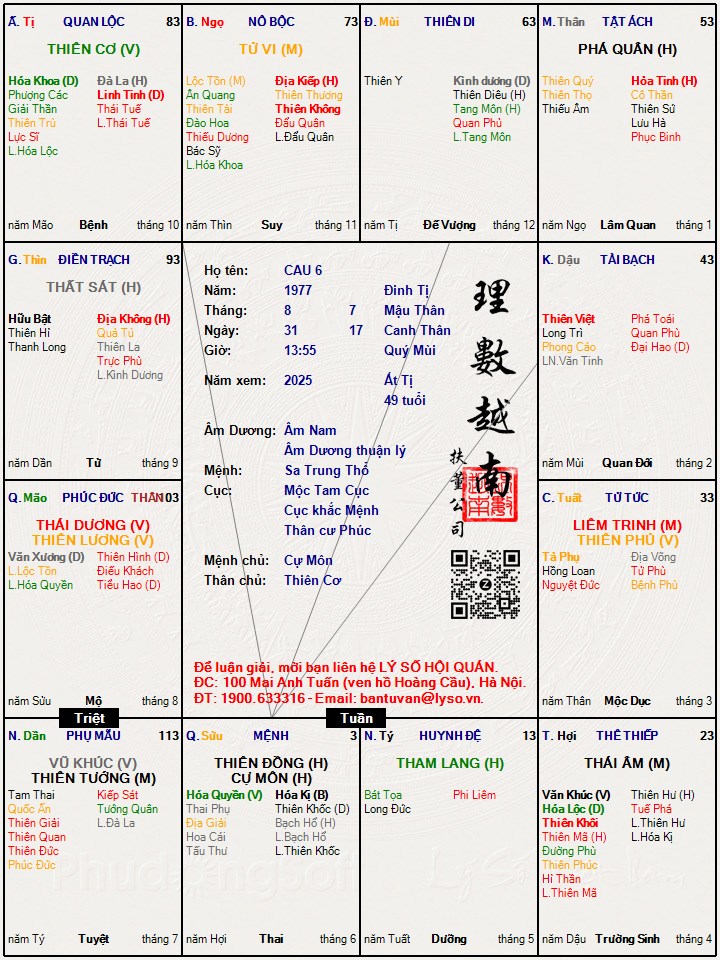 Hic thế sao mình lấy lá số nó lại là hãm nhỉ . Tiện bạn xem lá số này giúp mình với nó có xấu lắm không bạnsiunhan92dn đã viết:Văn xương ở tuất đắc địa nhóe ;)oreo đã viết:Bạn phuongdungleo ơi cho mình hỏi là văn xưởng mà ở tuất thì hãm địa hay đắc địa nhỉ @@.