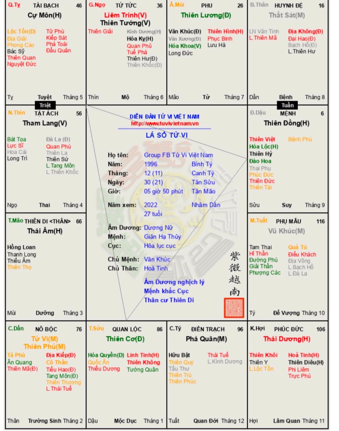 Mọi người xem giúp em lá số này ứng với bản thân chưa ạ. Nói sơ qua em cao khoảng m70, nặng 78-79kg, càng ngày càng dễ tăng cân, ngày xưa thì em hơi gầy, suy dinh dưỡng, người mập mập, mặt tròn, mắt cận, có nốt ruồi. Đã từng bị thương ở mắt hồi nhỏ ạ. Cảm ơn mọi người