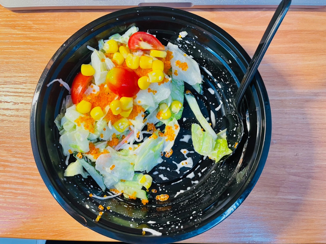 Thường bữa trưa em ăn cơm, nhưng nay em ra nhà ăn thấy toàn đồ dầu mỡ không à… Ngấy quá! Nên em mới gọi salad đó chớ