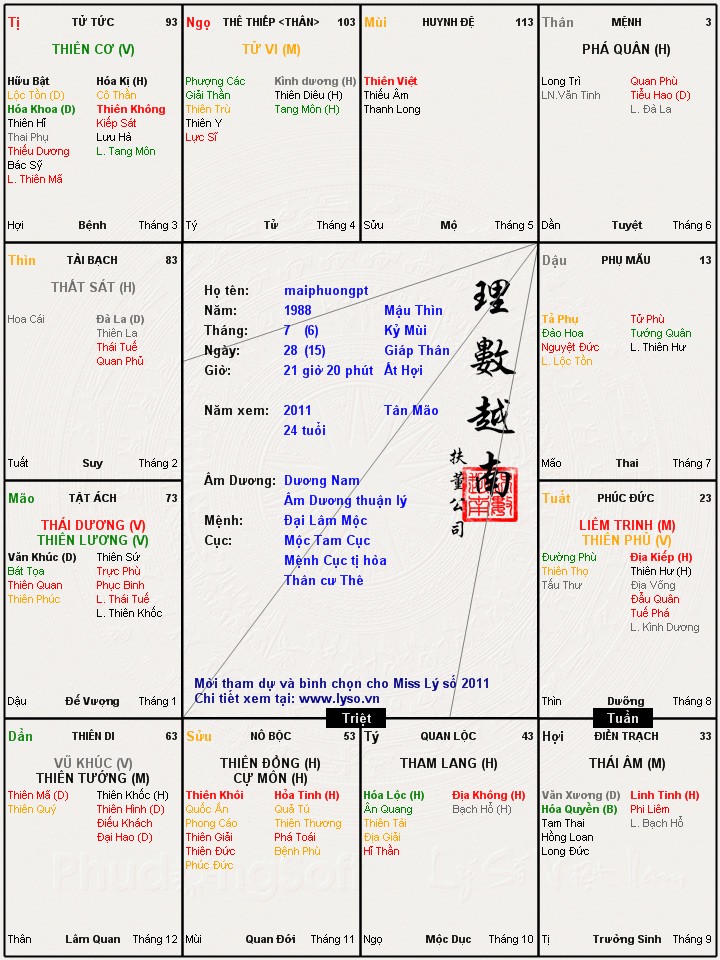 ;hic, lá số của mình cũng tử vi cư Ngọ, ai có thể xem giúp mình ko??? Thanks nhìu nha