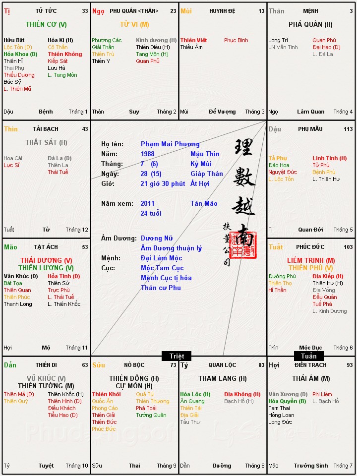mệnh tài quan có long trì bạch hổ hoa cái thêm phượng các toạ ở đại vận 23-32 nên gián tiếp kết thành tổ hợp tứ linh mang nhiều may mắn thuận lợi cho đuong số