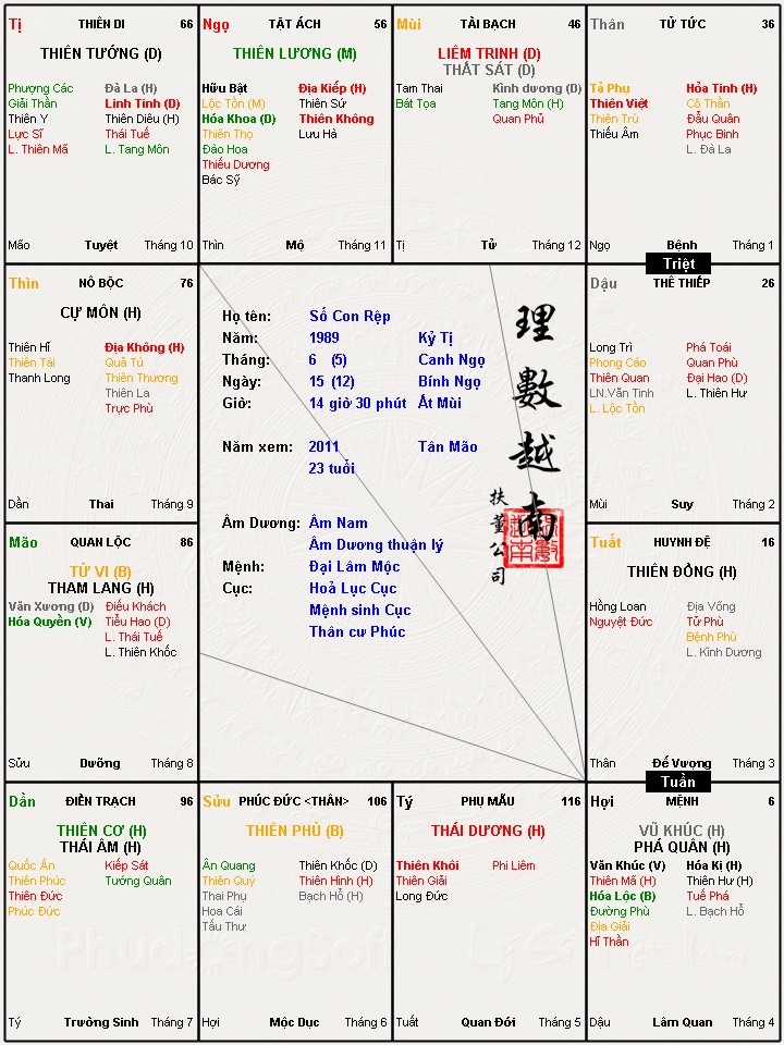 Năm sau của em khá mệt mỏi đây. Lưu đại hạn 23t nằm cung phụ mẫu thuộc Tý cung hành Thủy sinh cho bản mệnh là tốt. Nhưng tam hợp thân tý thìn hành thủy lại sinh nhập tam hợp tuổi tỵ dậu sửu hành kim vậy bản mệnh thiệt thòi. Sao thái dương hành hỏa cũng sinh nhập bản mệnh lại bị hãm, chưa kể nhiều sát tinh hội hợp vậy sẽ đốt ác liệt. May sao có khoa lộc quyền hóa giải khá nhiều. Tiểu hạn năm Tân Mão nằm cung Di thuộc Tị hành Hỏa, cung Tị là cung tuổi em nên em theo đuổi mọi chuyện rất chi là khó khăn. Ra ngoài cũng thường bất lợi. Bản mệnh vốn có thiên mã hạn vào cung có Tuyệt Đà thì mã gục, gục tại đâu