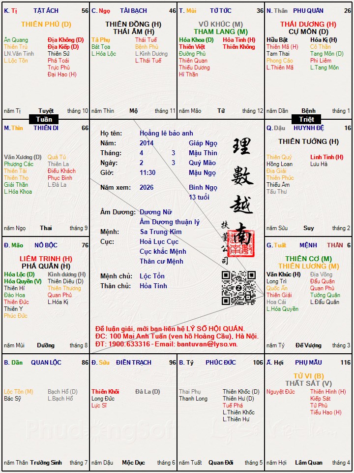 Các luận giải : Lá số tử vi - Hoầng lê bảo anh