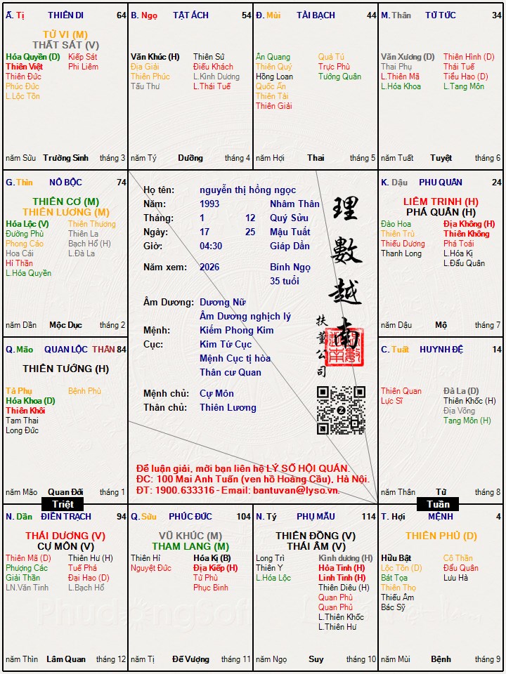 Các luận giải : Lá số tử vi - nguyễn thị hồng ngọc