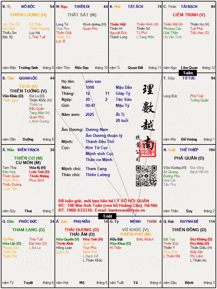 Tử vi đúng là khó xem. LS giờ Tý lasotuvi/1/7ZO4MIH1.jpgnhìn cũng được nhưng cũng ko rực rỡ lắm. Mệnh Thân tài quan ko có Lộc, Quyền, Khôi Việt. Vận 14 tới 23 và 24 tới 33 thì khá tốt.