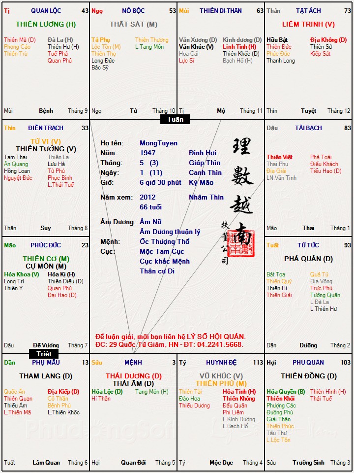 Năm 26 tuổi (NhÂm tý, 1972) tiểu hạn đến cung Huynh đệ, có Đào Hồng ngộ Lộc phùng Tả Hữu Thiên Nguyệt đức hội Tử Tướng Phủ Vũ: Mộng Tuyền được trao vai chÁnh trong phim Bẫy ngầm.