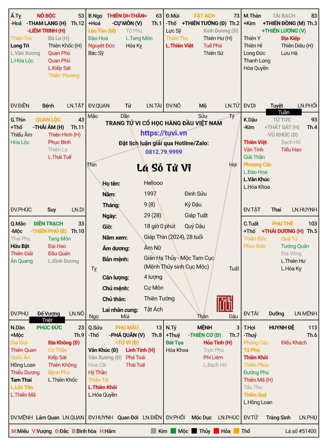 Khi sinh ra các cụ ghi lại giờ sinh 2h55 ngày 24/4/1979 dương lịch (giờ sửu - mệnh Thiên đồng ôm vòng Tuế hổ phù) - khả năng các cụ nhầm do thời khắc chuyển giao (giờ Dần - mệnh Thất sát ông vòng Âm Long Trực)
