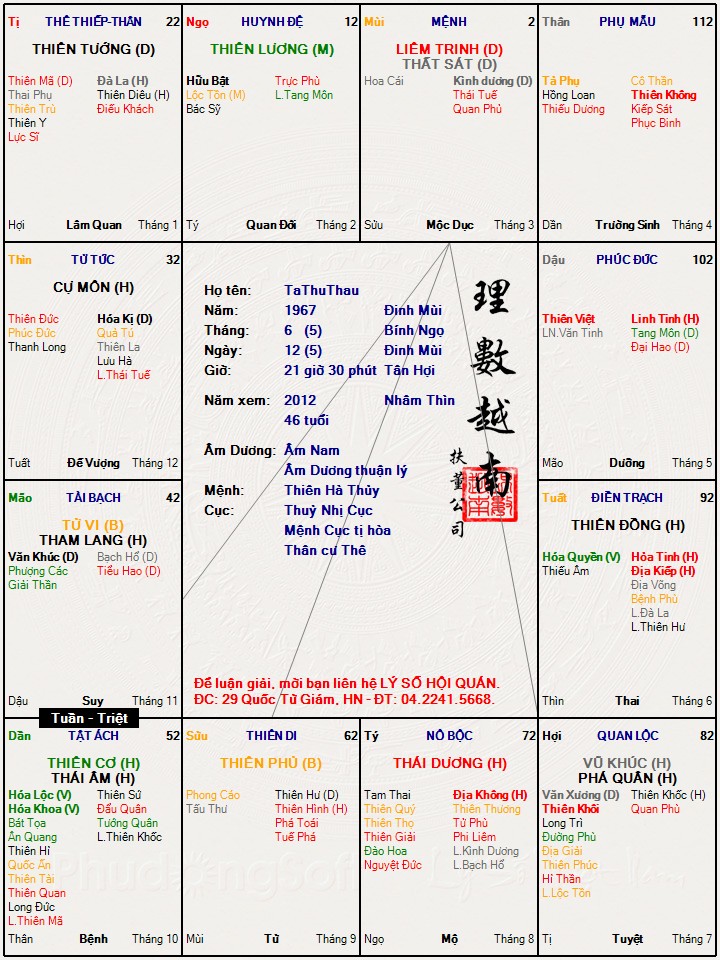 Số nÀy tam hợp Mệnh cũng là tam hợp tuổi, đÁng lẽ được một phần thưởng gì với thế gian mới phải vì bộ SÁt Phá Tham quá yếu (quá bÁn hãm địa) như Quan cung Vũ Phá bị bôi lọ, còn bị tù đÀy luôn phiên là khác (Liêm Xương Phủ) Tài Tử Tham yếu kém còn bị cả Tuần lẫn Triệt kể như là suông. Mệnh đóng ở tam hợp tuổi (Thái tuế) muốn được thỏa trí mãn nguyện, luôn luôn phải là giai đoạn tuổi ngoÀi 40.