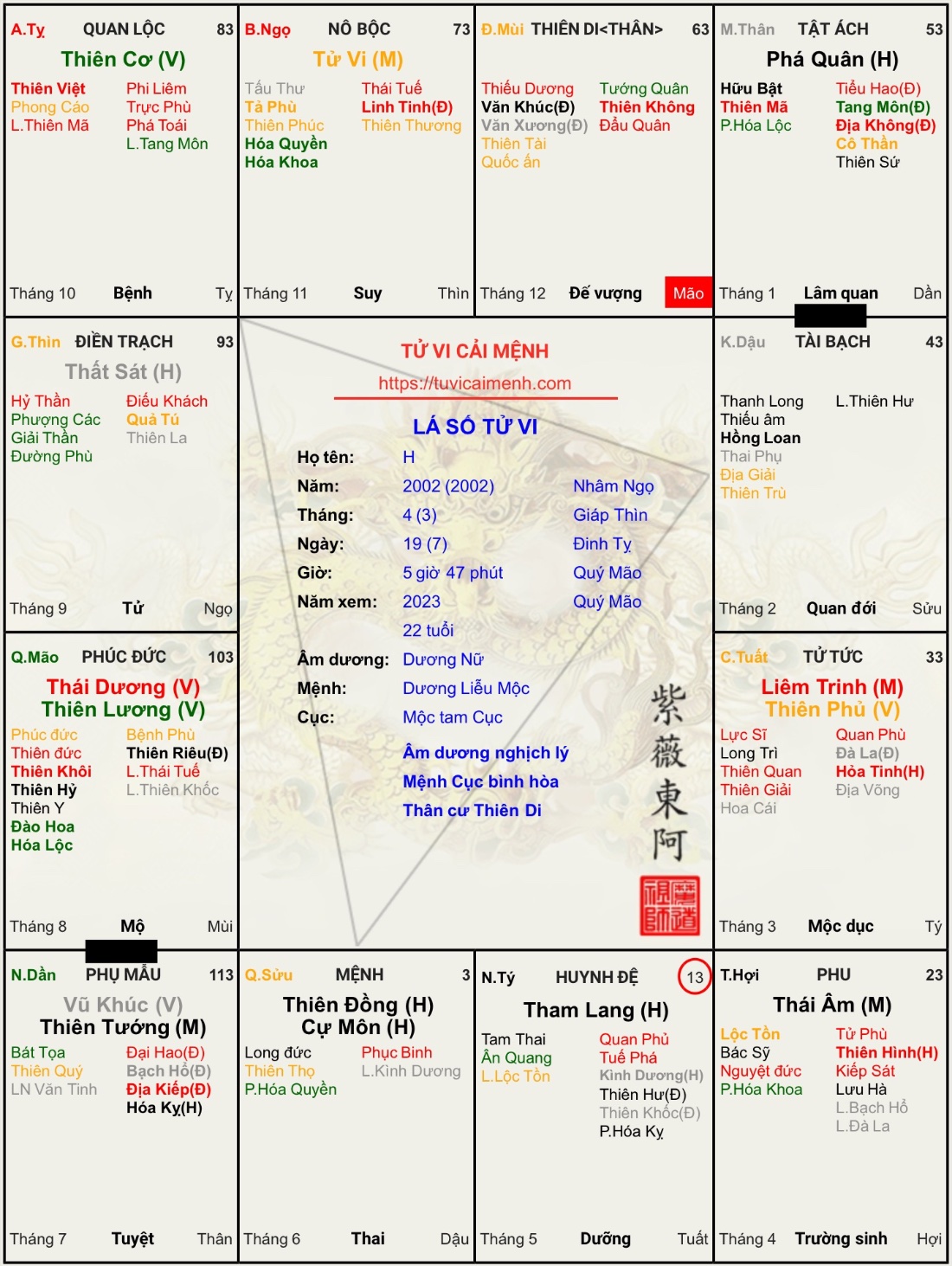 Ghi chú: bên tuvilyso hay lấy tháng sinh theo tiết khí, nếu lấy theo tiết khí thì là tháng Tân Mùi ( Thổ) mà ko lấy theo tiết khí, đó là tháng Canh Ngọ cũng ( Thổ). Kiểu gì cũng có nạp âm tương sinh liên tục.