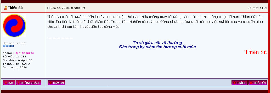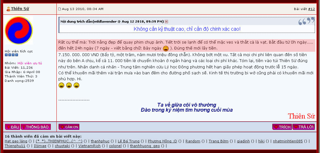 Như vậy là chắc chắn hôm nay có mưa, dù mưa nhỏ nhưng người đi đường phải mặc áo mưa và lượng nước đủ láng mặt đường. Có thể kết luận câu "Trong it nhất 7 ngày lễ hội chính trời nắng đẹp, không mưa vào ban ngày, thời tiết mát mẻ" đã sai. Vậy thì câu: "Nếu tôi dự đoán sai tôi xin từ chức Giám đốc Trung tâm nghiên cứu LHĐP" có giá trị nữa không. Hay chỉ là câu nói đùa ở quán bia. Là người có liêm sỉ nên tôn trọng đọc giả và hơn 1 vạn thành viên của mình trong diễn đàn.