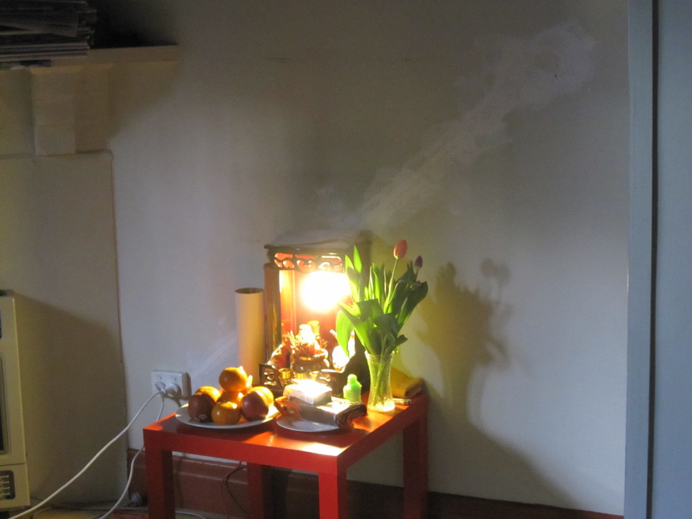 ban` thờ bạn bỏ lọ hoa đi , lấy cây nào có lá dài như là phát lộc...