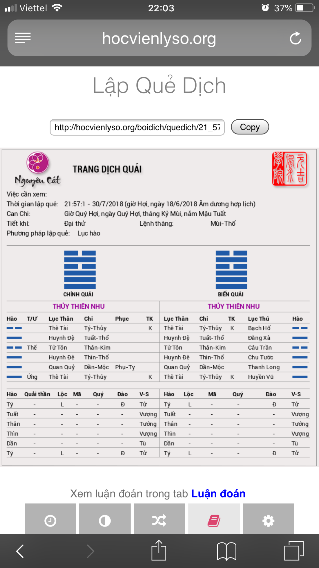 Thời gian gieo quẻ 21h45’ ngày 30/7/2018