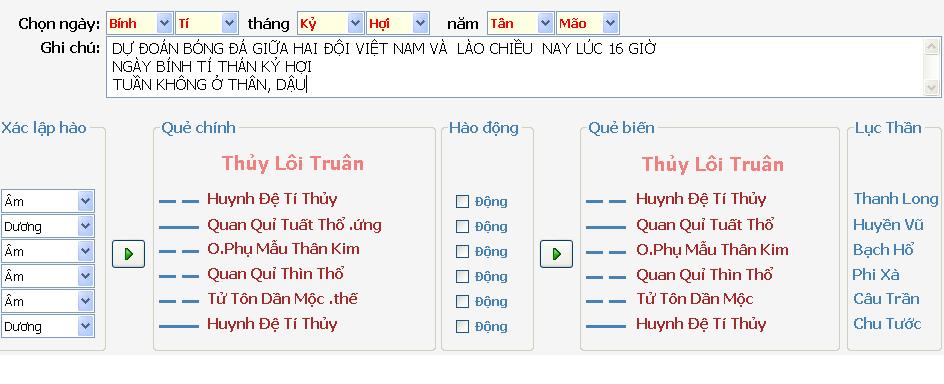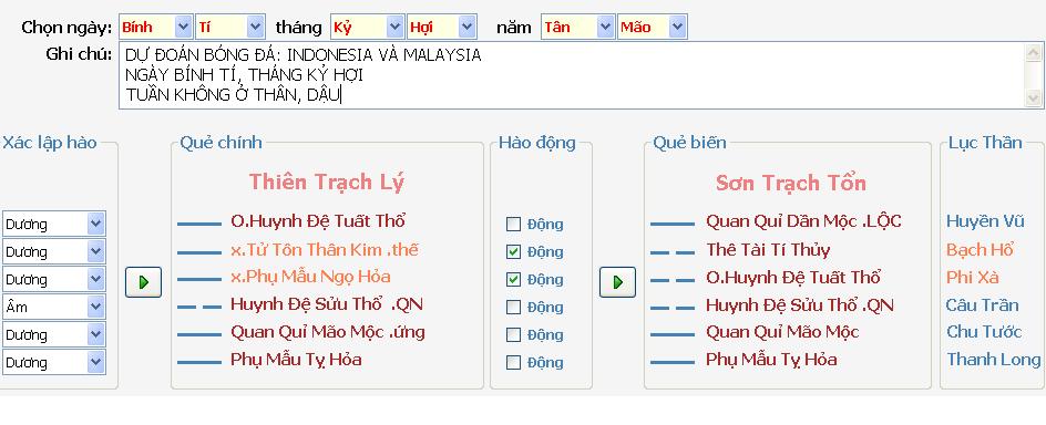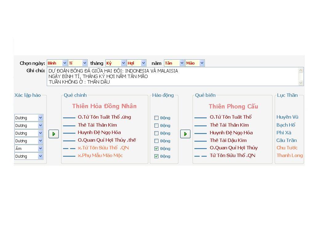 Không hiểu hôm nay tại sao tôi lại nhầm: bởi quẻ ở trên tôi xin thời gian hai đội đá vào lúc 16 giờ, nhưng nhìn lại lịch thì lại là 19 giờ nên tôi lại phải gieo lại quẻ. Tôi sẽ đưa quẻ này lên các bạn tham khảo. Nhưng tôi thấycả hai quẻ khó đoán quá. Không biết sự lầm lẫn ở quẻ đầu có phải gọi là lạc quẻ như anh Sugiakynguyenmoi nói hay không? xin anh cho ý kiến? để mọi người cùng rút kinh nghiêm. Nên đoán theo quẻ nào nhé!