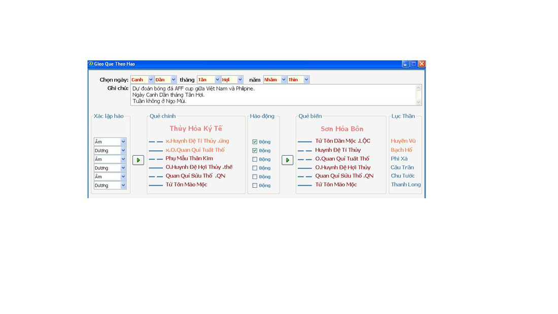 Hào thế là đội VN, ứng là Philippin cả 2 đều thuộc thuỷ lại được lệnh tháng nên 2 đội cân tài cân sức diễn biến trên sân đấu cũng tương đối ngang ngửa, ngày Dần hợp Hợi là hào thế nên đội nhà cũng được may mắn, có những cơ hội ngon ăn như tình huống phút cuối trận Tấn Tài xút trúng xà ngang, hào 4 Thân kim được hào 5 quân vương Tuát thổ sinh nên có lực vượng được ngày Dần xung ám động sinh cho cả thế ứng, tuy nhiên hào ứng động lực vượt trội hơn nên họ được kết quả hơn ta 1 bàn. Hào 4 biến hào 5 tương khắc với thế ứng thành tương sinh, hơn nữa nó ám động hoá sinh trở lại. Ở đây có điều cháu chưa rõ lắm về ý nghĩa hào ứng Tý thuỷ động hoá Dần mộc là tiết khí nhưng đội Philippin vẫn thắng trận, chú có thể kiểm chứng đúng sai của cháu
