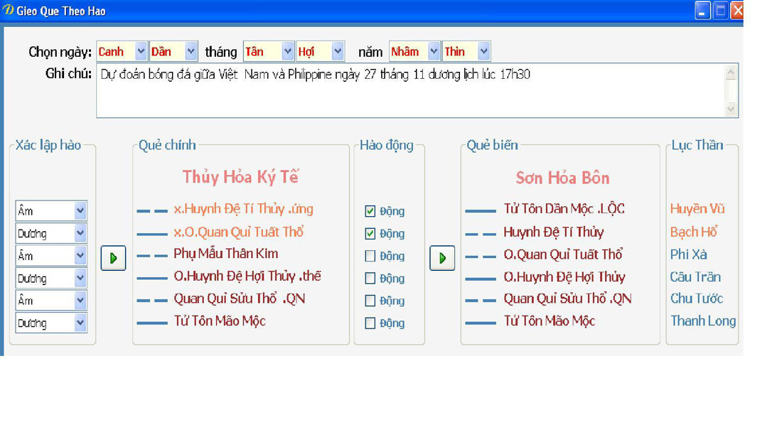 Hôm qua 24 tháng 11 dương lịch, trận bóng giữa Việt Nam và Myama ta đá thất vọng quá, hòa 1 - 1. Tôi cũng quên gieo quẻ trận này. Hôm nay tôi đã gieo quẻ cho trận giữa Việt Nam và Philipine vào ngày 27 dương lịch tức ngày Canh Dần tháng Tân Hợi, lúc 17h30. Mong các bạn thử dự đoán xem nhé. Tôi sẽ đưa bình luận sau. Hi vọng nhiều người tham gia. =D>