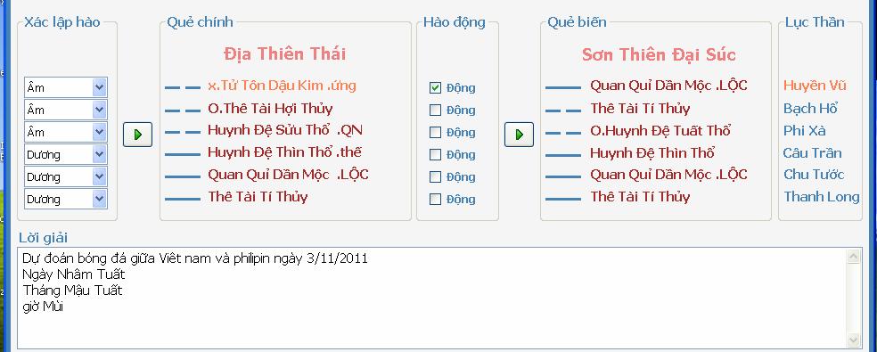 Huynh động mà hóa tiến thần chứng tỏ Việt Nam đã chuyển bại ở hiệp một thành thắng ở hiệp thứ hai. Như vậy, hào thế được nhật thần và nguyệt kiến trợ giúp nên rất mạnh. Lại huynh động trợ giúp, rồi hóa tiến thần, đáng nhẽ là phải 3 quả nhưng tôi không giám đoán như vậy vì đội bạn quá mạnh. Còn quả đội bạn đá vào lưới của Việt Nam không hiểu lí do gì, không hiểu có phải quẻ biến có Tí Mùi tương hại hay không?
