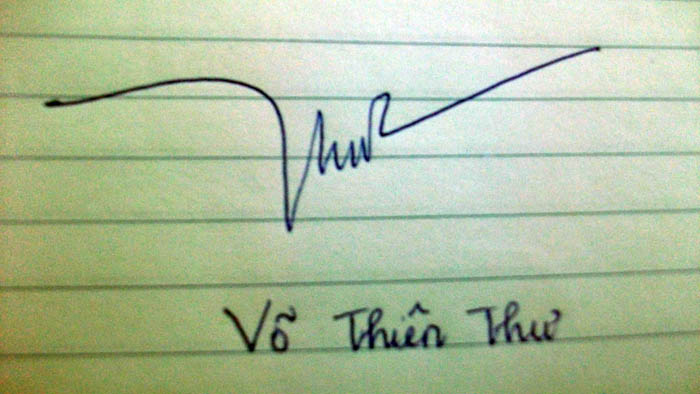Chị Thiên Thư: Số làm nhà nước một thời gian dài, ổn định sau đó thì đột ngột chuyển sang buôn bán nhà hàng - quán ăn. Số lấy chồng là người đoàng hoàng lịch thiệp, công danh của anh ấy khá tốt. Nói chung, chữ ký này nói lên một sự an nhàn, cuộc sống vợ chồng hạnh phúc. Cho tuongphap hỏi điều này. Có phải chị học nghành liên quan tới tiếp xúc nhiều người? Giống như là học để làm tiếp thị, quảng cáo ý. vì TP thấy chữ ký của chị lụt cụt nhưng phần đầu lại khá sải rộng tạo ra một cái bập bênh bên thì quá nặng bên thì quá nhẹ. Tức là người thì tính nhút nhát nhưng lại đi theo nghành đòi hỏi sự láu lỉnh !!!