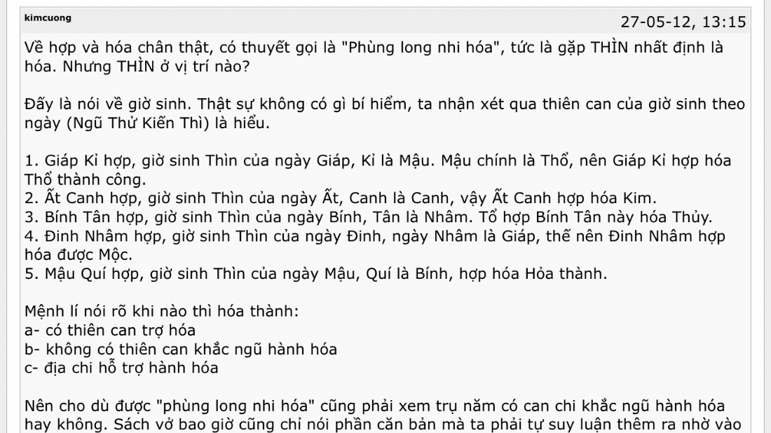 Nên cho dù được "phùng long nhi hóa" cũng phải xem trụ năm có can chi khắc ngũ hành hóa hay không. Sách vở bao giờ cũng chỉ nói phần căn bản mà ta phải tự suy luận thêm ra nhờ vào các nguyên lý khác.