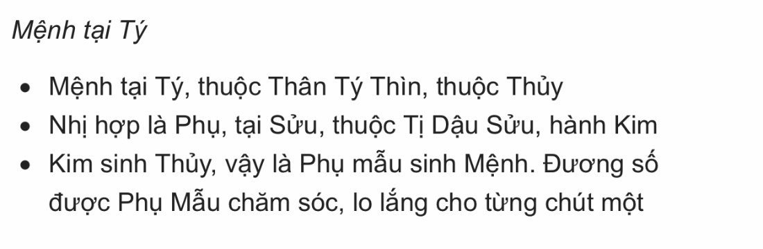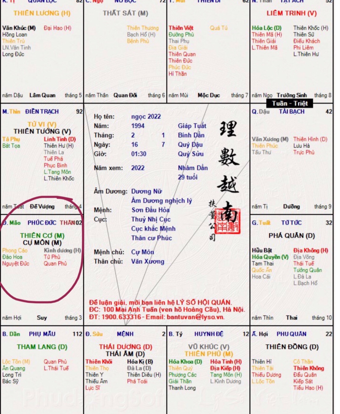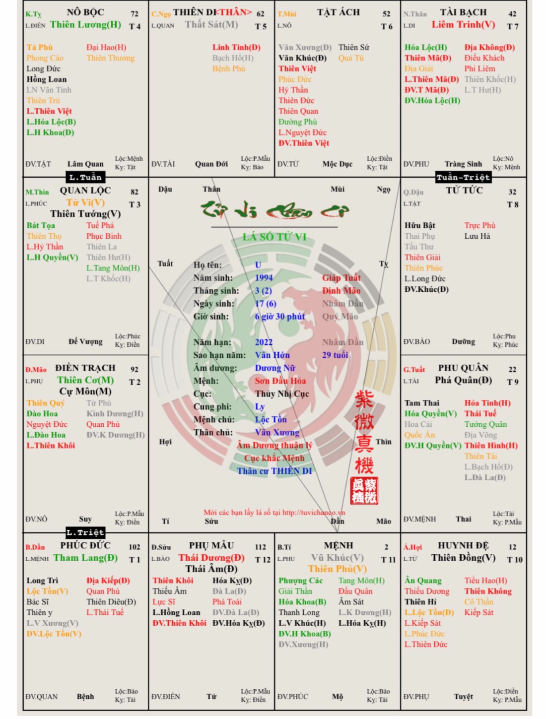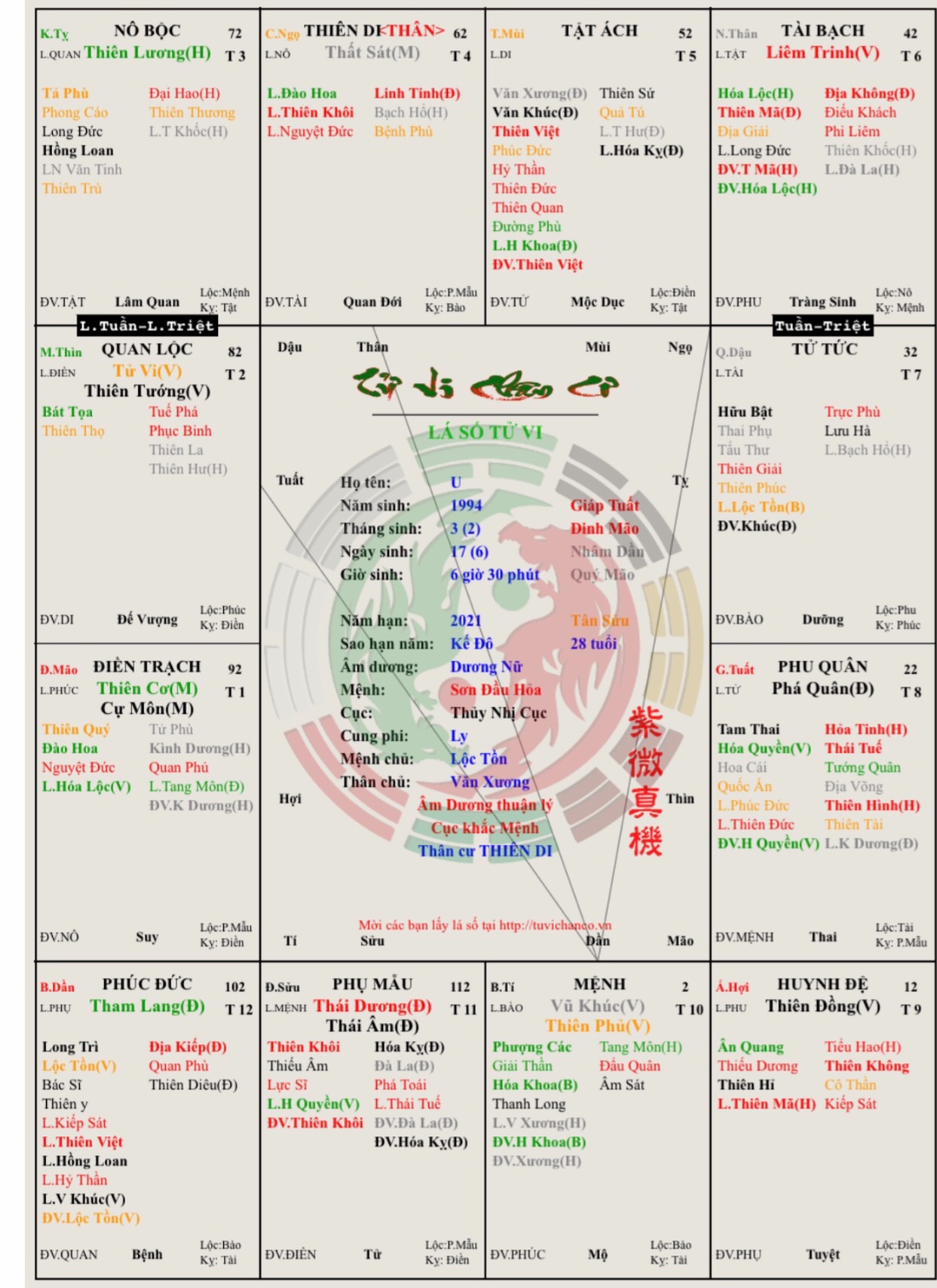 Lá số của em ngày giờ chính xác ko, theo như em nói thì anh thấy mệnh em đóng cũng sửu hợp lý hơn, mà cũng có thể là tử vi ko đúng với trường hợp của emYeutanhuong đã viết: 10:02, 11/03/22Anh xem lá em nhị hợp phụ mẫu, phụ mẫu không giúp gì em suốt ngày tìm cách hại em, em còn phải giúp họ mọi thứ tiền bạc....dayfine đã viết: 20:53, 10/03/22 Mệnh em lục hại với cung nô nên cả đời sẽ gặp vấn đề với bạn bè, đồng nghiệp, nhân viên... Em lại đang trong đại vận thiên không (22-31) ở cung hợi là đại vận thất bại, phá sản cho dù lúc đầu nó đưa mình lên càng cao thì lúc sau té càng đau thôi em. Đại vận này em đừng nên đầu tư gì cả, hoặc có đầu tư thì ít thôi và đừng mong nó mang lại lợi ích ngay, đầu tư ít ít rồi quên nó đi, đợi tới đại vận sau mới gặt quả. Đại vận này em nên học tập các môn huyền học hoặc tôn giáo nên làm các việc từ thiện, giúp đỡ người khác... Đại vận sau ở cung tuất (32-41) là đại vận thái tuế là đại vận tốt nhất cuộc đời em, đại vận đó em muốn làm gì đều sẽ gặt hái được thành công cao nhất