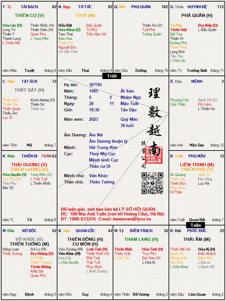 Bạn để tên SPT85, chắc là đã có thời gian dài nghĩ mình mệnh Sát phá tham? . Giờ sinh chắc đã từng phân vân giữa giờ Dậu và giờ Tuất? ( giờ Tuất thì mệnh Phá hãm khôi Việt, quan Tham Lang hãm gặp Khôi Việt Linh tả hữu khoa Kình ). Giờ Tuất thì học hành cũng khá tốt. Giờ Dậu thì vẫn đẹp hơn.SPT85 đã viết: 11:30, 16/05/23Chào bạn hysshu,hysshu đã viết: 23:29, 15/05/23Giờ sinh có đúng ko? Nếu đúng giờ sinh thì lá số đẹp. Chấm 7,6 điểmSPT85 đã viết: 22:31, 15/05/23 Xin nhờ mọi người xem giúp lá số này có phải ảnh hưởng Hóa kỵ cung Phúc lên đương số là xấu lắm không ạ? Bản thân đương số luôn thấy lo lắng, bất an, bi quan mặc dù cuộc sống có thể coi là khá ổn. Có cách nào hóa giải bớt ảnh hưởng xấu của sao Hóa kỵ này không ạ?