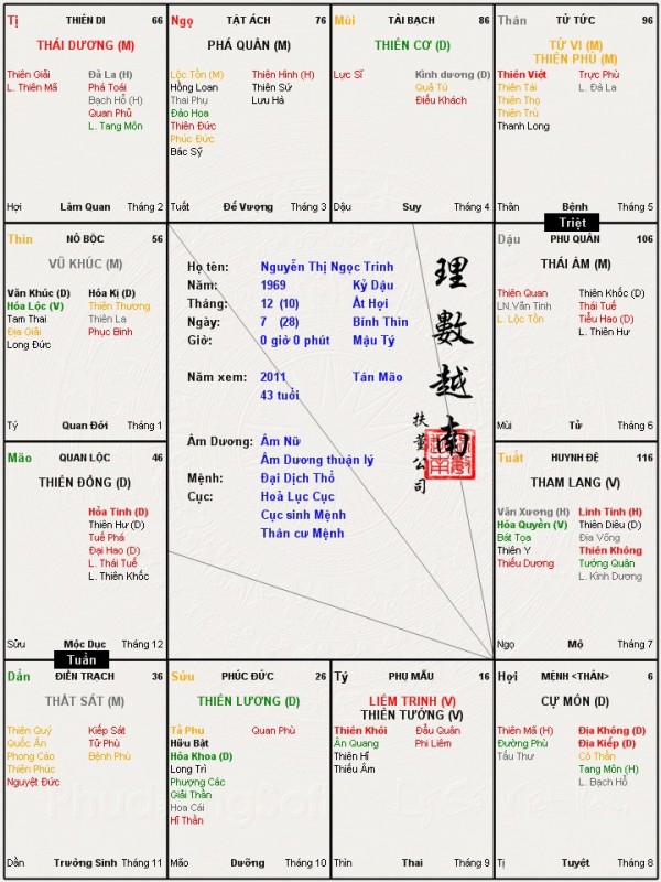Em nghĩ Tài Thọ không ảnh hưởng đến số con của đương số.donaldnguyen đã viết:Mình thì có cả Thiên Tài - Thiên Thọ ở Thiên Di, nhìn chung là người dân giúp đỡ rất nhiều và mình cũng sòng phẳng, đối đãi họ nhiệt tâm nên mình hoàn toàn hài lòng về khoản này. Đây là LS của mẹ mình, Tài Thọ đều ở cung Tử Tức nhìn rất hoàng tráng nhưng chỉ mỗi duy nhất mình là con 1, mẹ mình phá thai ít nhất 2 lần, nghe nói mình chỉ là con giữa mà thôi. Nhưng mối quan hệ giữa mình với mẹ rất xấu, nhưng từ nhỏ đến lớn cuộc sống của mình khá êm ả, đầy đủ, vật chất trên mức cơ bản đối với nhiều người, ít lo toan chuyện cơm áo, sống khá phè phỡn.