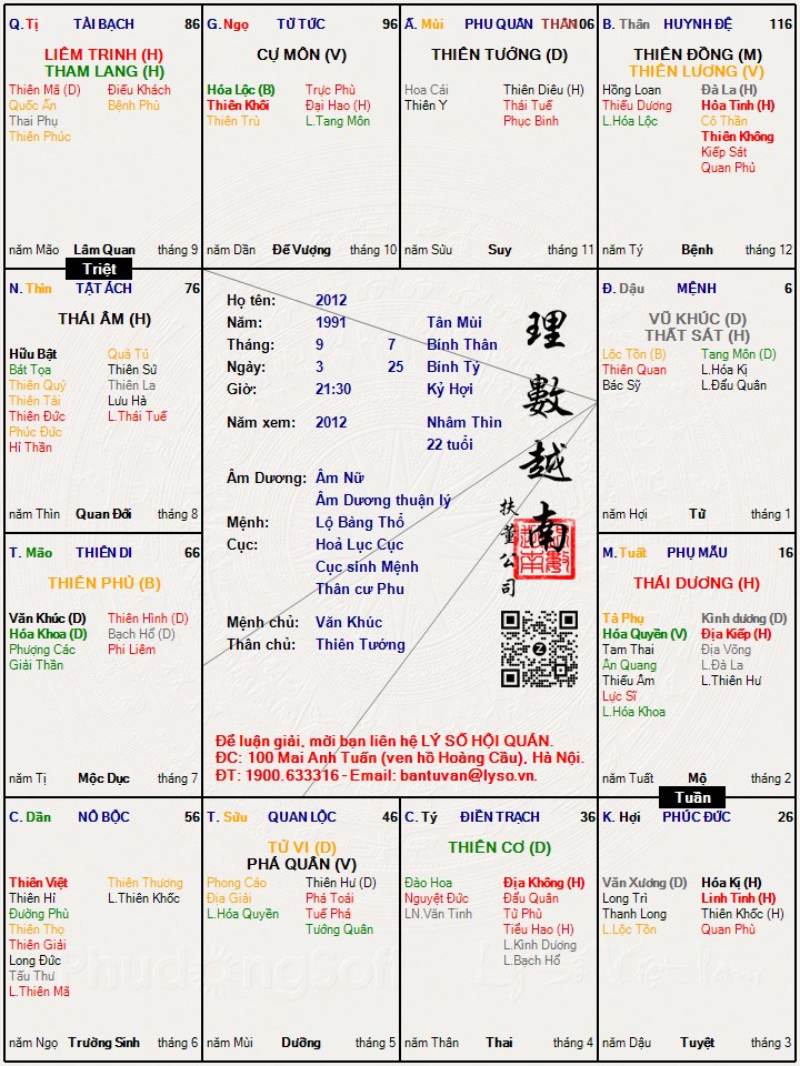 ..chào anh..Hình ảnh..chuyện là trong tháng 12 âl này em có quen 1 người trên mạng.. (bắt đầu chat chít vào khoảng ngày 8-12 âl) bạn này sn 91 bằng tuổi em..là người manly có cá tính mạnh mẽ..sống tình cảm..bạn này bày tỏ tình cảm với em vs muốn tiến tới S2 lâu dài..phần em thì cũng có cảm tình với bạn này (vì đúng tuýp gu con trai mà em thích :D ..vs nói chuyện với bạn này có 1 lực hút gì đó lạ lắm ?! ,lại có kảm giác an toàn vs dc che chở)..nhưng lại sợ em lại gieo đau thương cho bạn này như firtlove trc' ..nên em từ chối vs chỉ muốn làm bạn thui (phần vì hắn ta thấp quá..con trai j mà cao ngang ngưả cỡ em thui :D) ..em muốn nhờ anh xem giúp em hạn tình duyên vào tháng 12 cuối năm này như thế nào anh...??? • anh xem giúp em hạn ..tình duyên + công việc.. năm 2013 luôn nha anh ..ko biết năm sau em có tìm dc 1 công việc tốt để làm từ thiện ko anh ..?.. . ..vài nét về bản thân : - cao 1m63, 47kg , sống nội tâm, hơi cọc tính ,thích làm việc thiện nguyện... - đã làm hết 4 việc, nguyên năm nay ở nhà - ba mất 13.5.2008 âl - có 1 em trai - 2011 : quen và chia tay bạn trai - cùng năm 2011 mẹ đi bước nưã ,con 2 dòng . - lá số năm 2012 : https://lyso.vn/lasotuvi/2F4RGYRY.jpg" target="_blank ..- lá số năm 2013 : Hình ảnh ..chúc anh 1 ngày vui vẻ ..! ..hì hì..