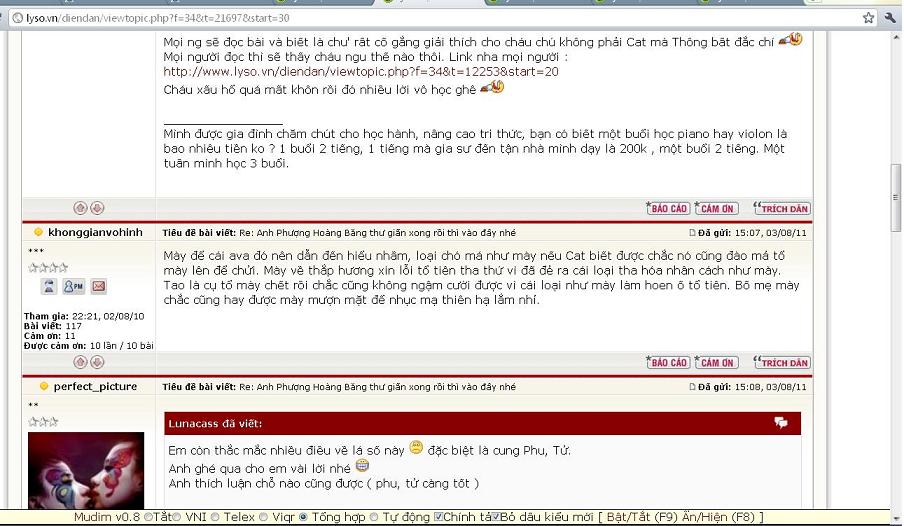 Lý Thông đã viết:Một con bé mất dạy ra đời 16/2/1994 lúc 0h45 phút, di của nó có điếu khách. Ra ngoài thì bố láo với xã hội, về nhà chửi bố mẹ, cung phụ mẫu của nó 1 đống sát tinh, ấy thế nhưng sau lại lấy được thằng chồng thôi rồi, toàn nước mắt và buồn khổ. Cũng phải thôi vì cái thói mất dạy láo toét ăn sâu vào não nó, đến bố mẹ nó còn chửi huống chi thằng chồng chịu được. Xem qua hạn năm nay của nó cũng toàn nước mắt, bảo sao cái thằng ngay tháng trước BỎ nó lại đối xử với nó như thế.