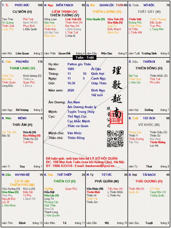 Ngày sinh lá số này chuẩn 100%, giờ sinh độ khả tín AA, thông tin trên astro có hết. Do ngày hôm đó giờ chính Ngọ là 11h36' ( theo lời anh Long Đức) nên lá số này vừa sang giờ Tuất được 2 phút, chỉ cách nhau 2 phút giữa Dậu và Tuất nên không thể ứng với lá số giờ Thân . Trong 2 giờ Tuất, Dậu thì giờ nào ứng hơn thì lấy. Cảm ơn bác. Em ủng hộ giờ Tuất. Hơn nữa nhìn giờ Thân lasotuvi/1/M5C0SWYY.jpg lá số Tử vi ko có gì đặc sắc, quan lộc lại bị Tuần Tiệt, Hóa Quyền bị Tuần lẫn Triệt. LS kém, không ứng với 1 đại tướng lừng danh.ĐỗVạnThông đã viết: 23:27, 27/04/22 Đang bà đầm thép lại chuyển sang tướng Patton là sao?!