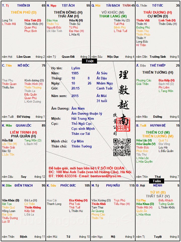 Khôi Việt đã viết:Mới nhòm qua Tử sát Tỵ Hợi có Tả Hữu, Xương Khúc, Lộc Mã cứ tưởng là chính nhân quân tử, gái theo dập dìu, giàu có khác thường...liếc qua cung Thân Vũ Tham sữu mùi Hỏa Linh trốn mất hết lại bị triệt..thì là loại khá keo kiệt, chỉ biết tính toán cho mình, mọi người cho là tiểu nhân nhưng bản thân lại tự nhận là hào phóng, tính cách cứng rắn có tài năng, không thích bị quản thúc, có tinh thần sáng tạo, mạo hiểm chịu khó đánh bạc ở xa nhà và uống gụ ké...