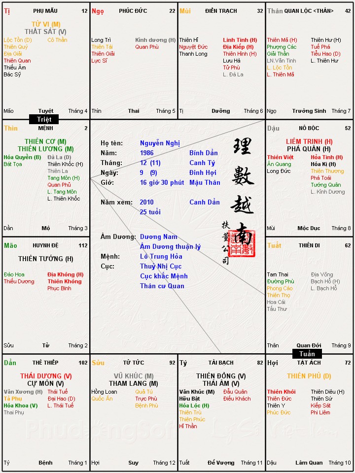 Mình nói suy nghĩ cá nhân thôi nhé, cung nô không xấu bằng cung thê, bạn có nghĩ thế k? Theo tìm hiểu của mình thì xem cung thê phải xem kèm cung nô. Theo lá số này thì lấy vợ khó khăn, cấm đoán, vợ chồng hục hoặc, hình như vợ còn hơi lăng nhăng. Bạn xem có đúng vợ hơi lăng nhăng k?thongle2010 đã viết:thực ra bộ CƠ NGUYỆT ĐỒNG LƯƠNG mà đi với cái đám hung tinh đó phản ảnh tư cách gia chủ có vấn đề, vì vị trí thân mệnh đóng quá hay nên về công ăn việc làm cũng rất khá nhưng coi chừng GÁI GÚ. Bản thân gia chủ là người TỰ CAO TỰ ĐẠI, MÊ GÁI nên tới đó công việc thì không sao nhưng tình cảm thì coi chừng. Xấu nhất là cung Tử tức và cung nô. Gia chủ mệt với 2 cung này nhứt.