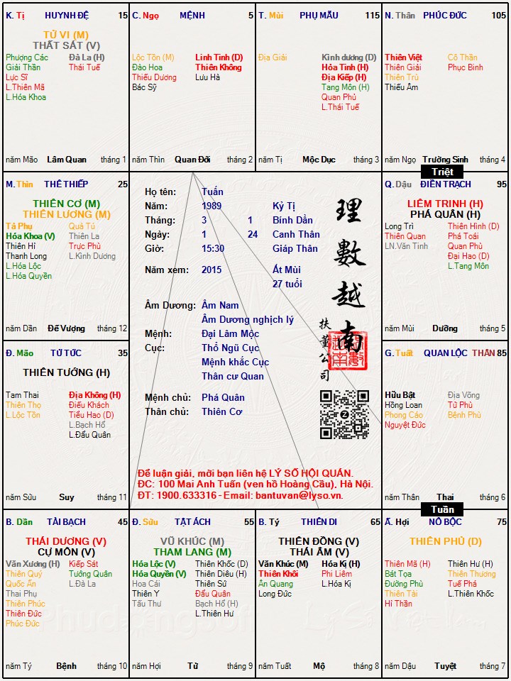 Về đại vận: từ 23-37 là vận thương quan, mà thương khắc quan, đây lại là vận kỵ thần, nên trong cv sẽ xuất hiện nhiều trắc trở, kết hợp với cung mệnh linh xương kỵ, thì bạn cứ chạy sắp đến đích thì có thằng nó ngáng chân, nên phải kiên trì thôi. Năm 2016,2019, 2022, 2025 phải cẩn thận, nhất là các tháng 1,4,7,10 âm lịch.