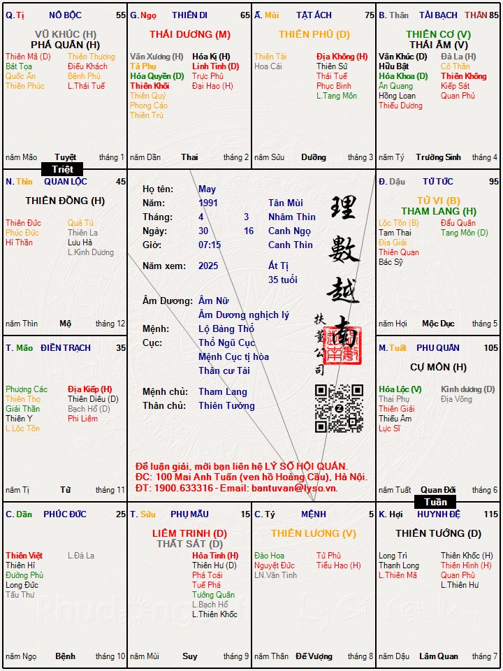 Chào bạn, đây là lá số của mình, mình đã từng nhờ bạn luận giải và gửi ảnh cho bạn nhưng ko có thời gian trao đối nên hẹn lại khi khác, bạn xem giúp mình nhé, ảnh mình sẽ gửi qua thư cá nhân, bạn cho mình địa chỉ gửi nhé