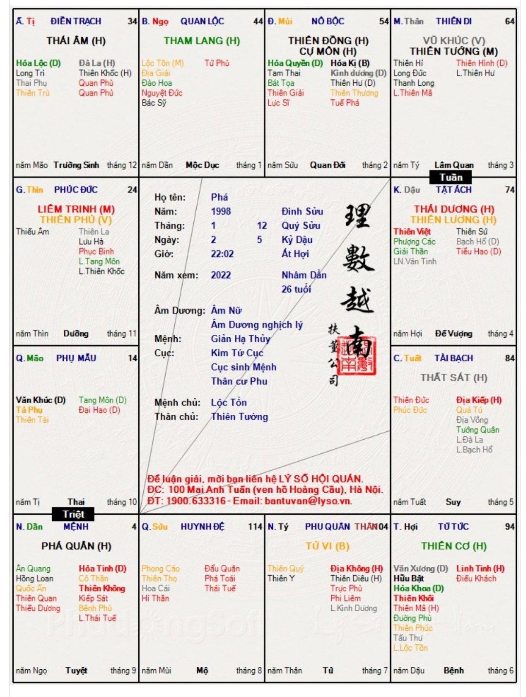 Bổ sung thêm. Lá số này có cái may mắn là vận đi gặp được Lộc. Năm 34 tuổi rớt vào cung Điền có thái âm hoá lộc, tuy người mệnh thuỷ đi đến đại vận cung hoả thì có cái không thuận nhưng vì mình là thuỷ mình dập được hoả nên vẫn ok, tiếp đến 44-54 tuổi lại gặp lộc tồn. Tuy tuổi Đinh ăn được ít lộc tồn hơn nhưng vẫn có lộc. Gia đoạn từ 34-54 nếu nỗ lực thì sẽ có thể phát lên. Bởi vậy mới nói mệnh tốt không bằng thân tốt, thân tốt không qua vận tốt.Phá đã viết: 13:25, 26/03/22 26 tuổi, không có tình cảm, không có nghề nghiệp, cháu thực sự rất chán nản. Từng có một mối tình nhưng chẳng đi về đâu, vết thương lòng để lại quá lớn. Từng có một công việc văn phòng, nhưng nghỉ ngang vì muốn thi vào nhà nước vì đinh ninh có cơ hội. Đợi chờ suốt nửa năm kì thi vẫn chưa tổ chức, mà giờ cũng biết khó để vào được. Mẹ thì vẫn mong muốn cháu vào nhà nước và bảo sẽ giúp cháu vào, nhưng cháu biết không hề dễ dàng. Không biết mình yêu thích gì, muốn làm gì, tự thấy bản thân không đủ năng lực, không dám bước ra khỏi vùng an toàn. Nhưng cũng may mắn trong những ngày ở nhà này, cháu khám phá ra được nhiều thứ, về sự sống và chữa lành. Cháu đang tập tành ăn thô và tập sống, suy nghĩ tích cực hơn, nhưng đôi khi vẫn không kìm nỗi sự bất lực. Mong các bác/cô/chú/anh/chị đã trải qua những cảm giác tương tự cho cháu vài lời khuyên và truyền thêm giúp cháu động lực trong cuộc sống. Mong cao nhân hữu duyên có thể thông qua lá số đưa ra giúp cháu vài lời khuyên hướng đi nghề nghiệp của mình ạ. Cháu cảm ơn mọi người nhiều!
