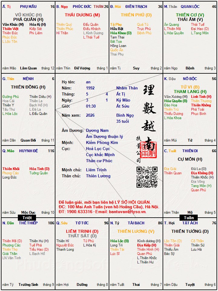 Lá số của bạn rơi vào cách hình kỵ giáp ấn rồi, bố mẹ hà khắc, chì chiết, anh em hay gây chuyện thị phi tranh chấp ngầm. Mệnh thiên tướng lại có đào hồng thủ mệnh chắc đẹp trai lắm nhỉ. Lại có văn khúc miếu, thế này chắc tán gái như mỏ khoét. Kaka lừa tềnh hết bao nhiêu em rồi. Nhà ở đâu thế, a e gặp nhau làm quen cái đồng cảnh quá