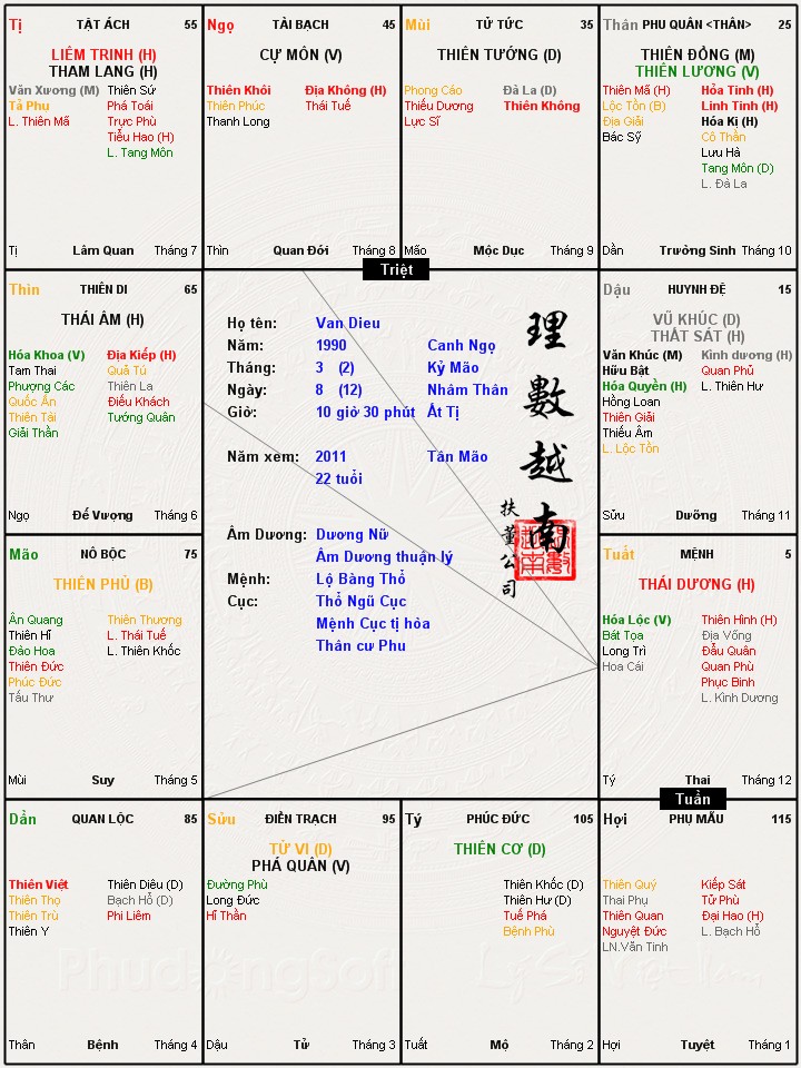 Em muốn hỏi về cách tính lưu đại hạn. Với lá số này thì lưu đại hạn năm 2011 là ở cung nào ạ? Năm nay cơ hội kết hôn có cao ko? em xin cảm ơn