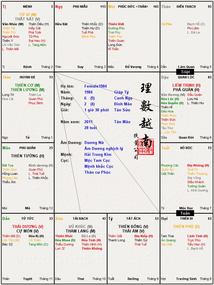 mình có một cô bạn rất thân làm bên bank ở trung tâm Saigon xinh đẹp, công việc ổn định, thu nhập khá nhưng đến nay đã 28 tuổi vẫn chậm chạp đường duyên tình. Năm nay cô ấy gặp nhiều điều ko may trong cuộc sống nên rất muốn được các bạn, các anh chị và các bác am hiểu tử vi cho vài lời luận về đường tình duyên, con cái và sự nghiệp về sau.