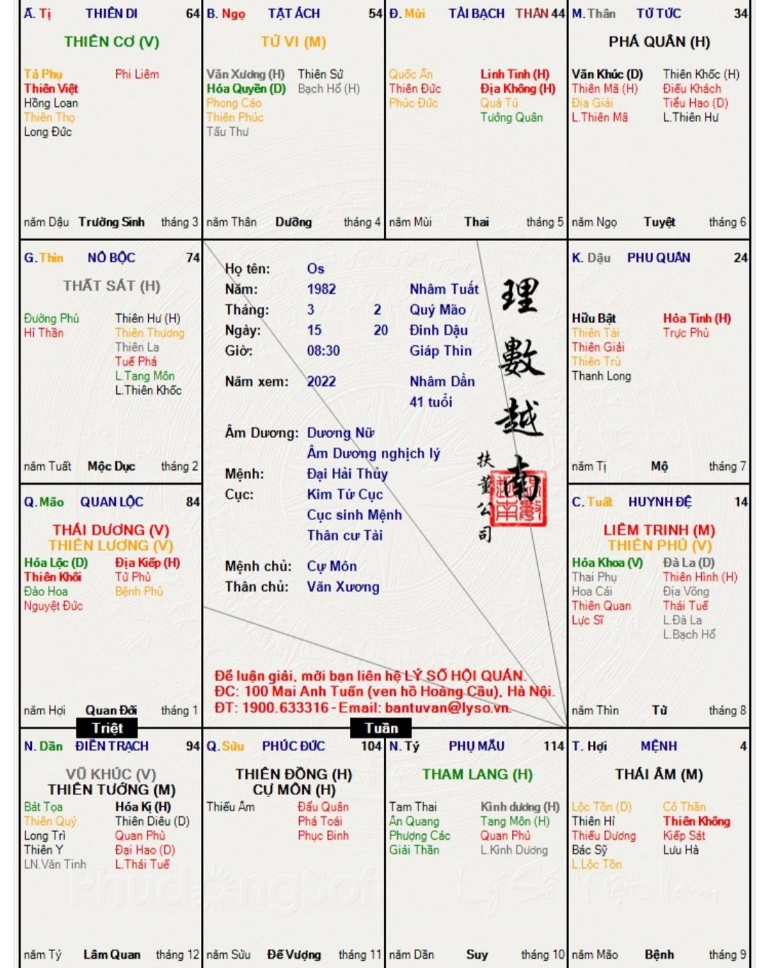 Có chút năng lực đấy chứ , dù là mối quan hệ mờ ám mà lên , cũng phải có năng lực mới đc , chứ bảo bà bán rau ngoài chợ , diễn y hệt mà lên thì cũng khó .Kinhhoa147 đã viết: 12:05, 14/01/23Dạ tụi e cũng không biết làm sao nữa ạ.begauhn đã viết: 11:45, 14/01/23Người này nắm dc khoa quyền , thêm 1 phần bộ tứ linh , có 2 sao đài các , nhưng cũng ăn cả kỵ . con người này thông minh tư duy ko tệ , cũng xếp là trên dân thường 1 tầm suy nghĩ .Kinhhoa147 đã viết: 09:44, 14/01/23 Đây là sếp em, tính cách lạ lùng. Các bác có thể xem hộ xem tụi em còn có thể gắn có với chị ấy nữa ko? Chứ ai làm chung cũng bỏ của chạy lấy người hết cả rồi.. Tụi em cám ơn nhiều ạ.