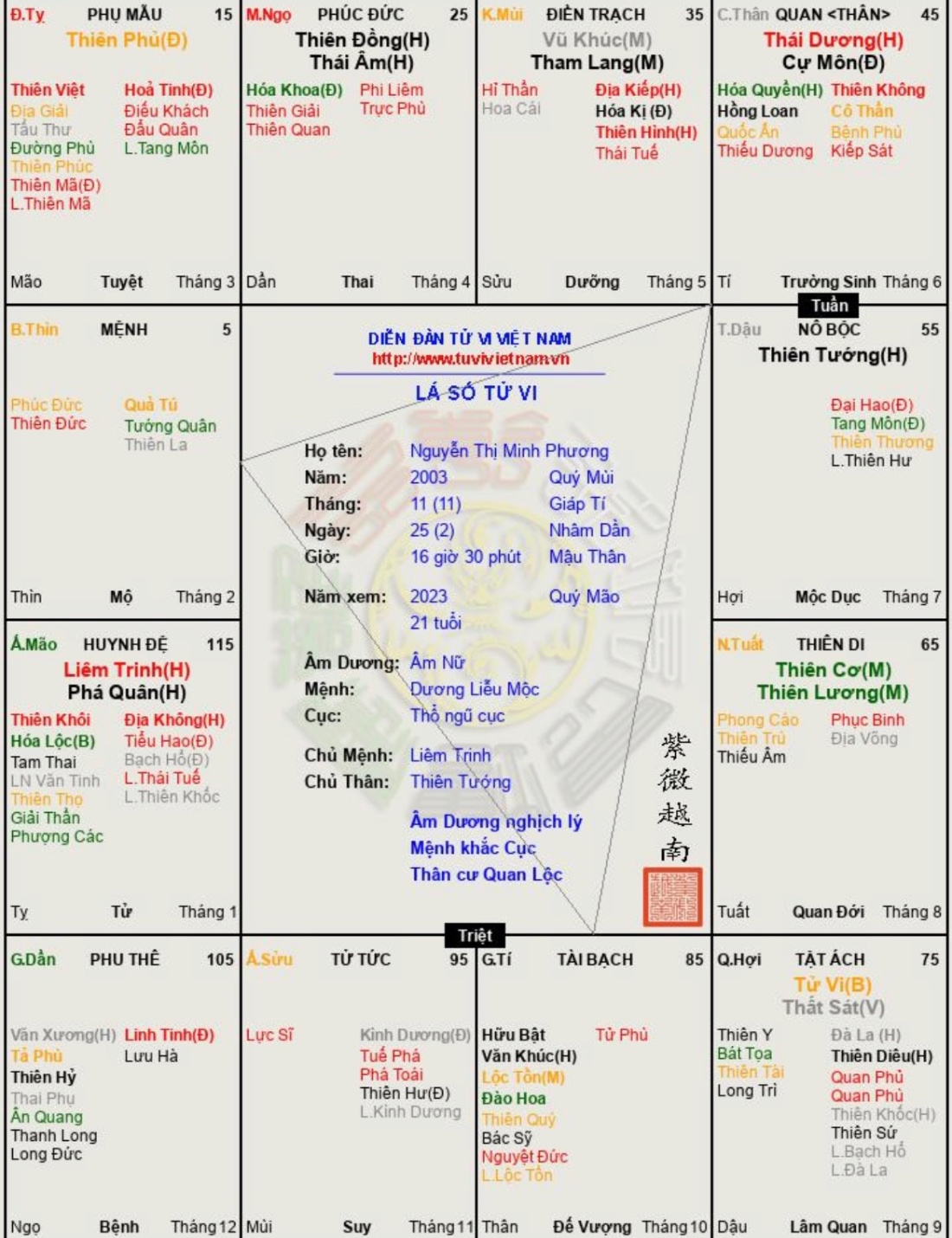 Cung Nô bộc và cung huynh đệ nợ nghiệp nhân quả , vướng mắc mâu thuẫn thị phi , mất 2 bộ tam hợp trợ lực đời sống này , giống như ko biết bơi mà cũng chẳng có cọc để nắm .pngt đã viết: 01:04, 20/08/23 Con/em mong được xin đôi lời về lá số ạ. Hiện tại là khoảng thời gian bế tắc và trì trệ của gia đình con và chính bản thân con vì làm mọi thứ đều không suôn sẻ. Cho con/em hỏi lá số này có số xuất ngoại không? Có nên xuất ngoại không ạ . Hiện tại con/em năm ba đại học nhưng còn rất mông lung sợ tương lai không kiếm được ra tiền và muốn đi xa để có thể học hỏi nhiều và trải nghiệm nhiều hơn ạ