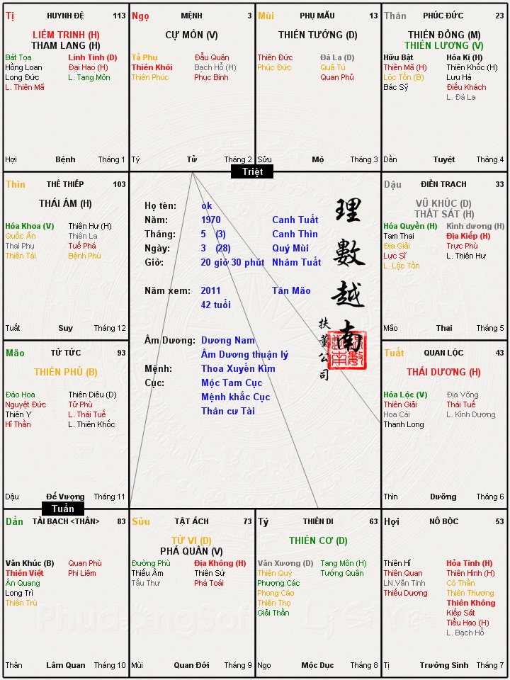 @xinchao12: Tôi e người này khó qua được đại vận tử tướng tuần triệt hội tang hổ tại 56, bản thân mệnh lại VCD nên càng khó thọ. Đầu đại vận thường nặng lắm. Cái chết của tử tướng này toàn là chết tai nạn hoặc cũng phải chết trên bàn mổ, nói chung phải dính tí hành kim vào người trước khi chết.