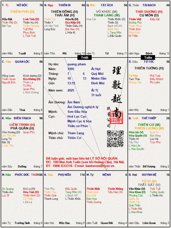 Còn chuyện tránh các tuổi khi kết hôn thì mình cũng không tin lắm. Bằng chứng là nhiều người chọn tuổi rất hợp nhưng rồi vẫn sinh chuyện, đơn giản vì là nó đã ứng với điều đó trong lá số rồi. Hơn nữa trong cung phu thê của bạn không chỉ có quan phủ mới xấu. Bản thân Thiên Lương hãm địa cũng đã đủ xấu rồi. Nếu tính các cung xung chiếu nữa thì đủ cả sát, mã, đà, tang, điếu, tất cả lại cư ở đất tuyệt nữa.