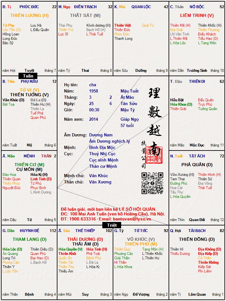 Lại coi tiếp tới lá số của cha thì tiểu hạn 2014 là Tang mã khốc hư, tiểu hạn Tử tức k khỏi rùng mình. Lá số của cha ngocnu xin post link https://lyso.vn/lasotuvi/1/003025 ... 14/cha.jpg" target="_blank