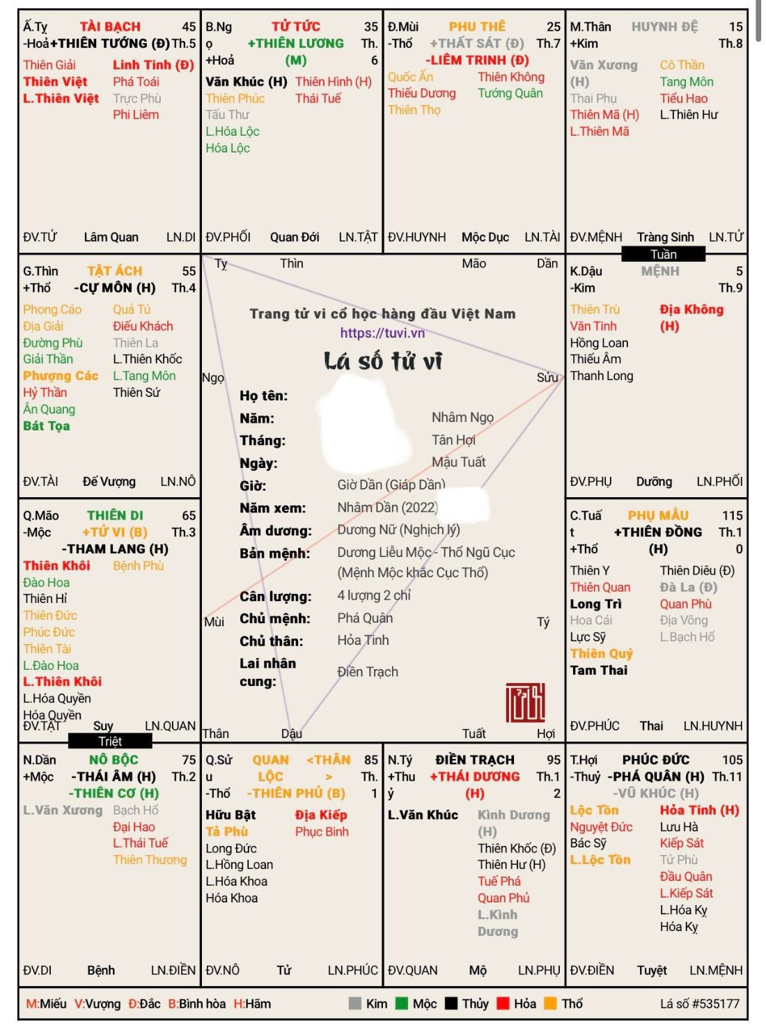 Em có lá số cũng hơi giống anh trên đây. Anh chị hữu duyên xem qua cho em lá số này cung phu thê có xấu lắm không ạ? Rồi sự nghiệp của em có ổn định không ạ? Em xin cảm ơn.