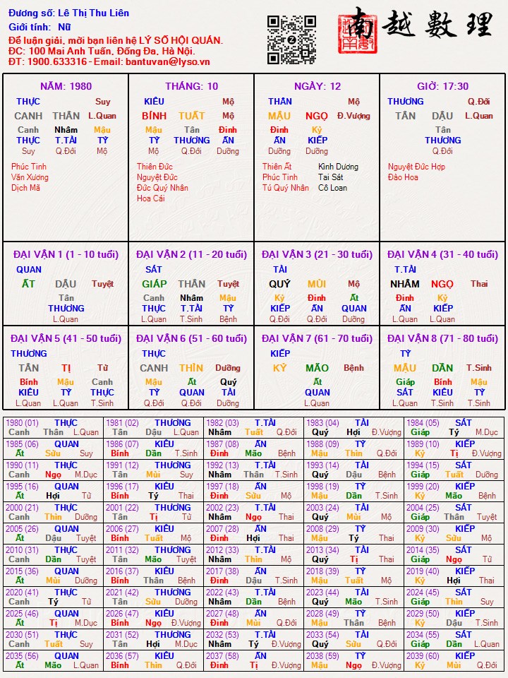 Đây là lá số của bạn gái: Lê Thị Thu Liên 04-09-1980 (Âm lịch)